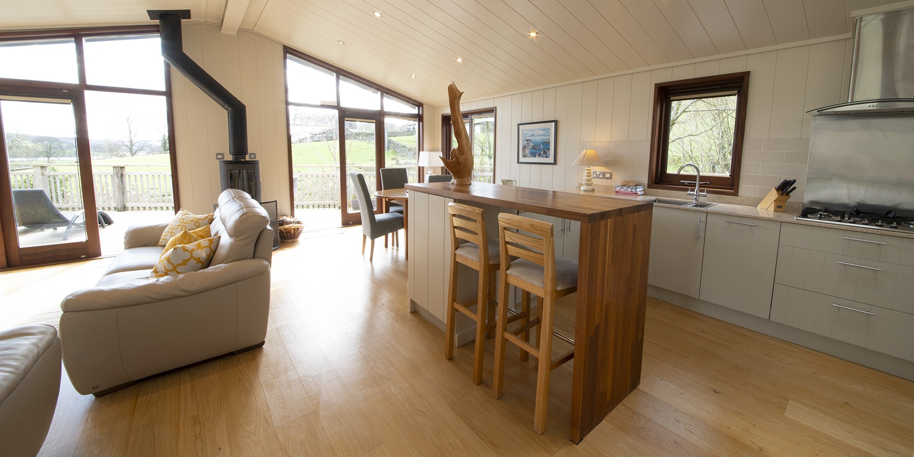 Along the decking with wonderful lake views, the private entrance leads into a very useful boot room with seating and plenty of hanging space for outdoor gear. Through to the hallway, the glass doorway leads into the very spacious and beautifully appointed open plan lounge, kitchen and dining area. This is an open plan living at its best, with oak flooring throughout and two sets of double glass doors leading out to the decked veranda, to enjoy the open countryside. The beautifully furnished lounge area is warm and cosy with a log burning stove and a very stylish large leather sofa and love seat and co-ordinated furnishings. There is a wall-mounted 50-inch flat-screen TV with Freeview, Streaming Apps, Blu-Ray DVD Player, blue tooth speaker and free wireless broadband. The comfortable dining area has a circular oak dining table and comfy chairs, ideal for romantic candlelit dinners. The superbly fitted open plan kitchen is very well equipped with everything you will need and a few special extras too, including a wine fridge. The spacious bedroom is luxurious and beautifully furnished with quality furniture and a king-size bed. There is a large walk-in wardrobe providing lots of storage space and the double full-length windows look out towards the lake. The fully tiled en-suite bathroom has a walk-in rain shower and a heated towel rail. There are complimentary toiletries and guest bathrobes and slippers provided for your comfort. In addition, there is a second bedroom with a fixed king-size bed and a house bathroom which is fully tiled with a rain shower over the bath.